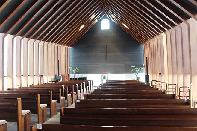 주중과 주말에 실제로 예배가 진행되는 교회라 건물 내부는 예배당으로 꾸며져 있는데, 교회 예배당이라기보다는 성당에 온 듯한 느낌이다. 자연광이 잘 들어올 수 있도록 설계돼 촘촘한 나무 벽 사이로 배치된 좁은 창을 통해 빛의 스트라이프가 만들어진다.