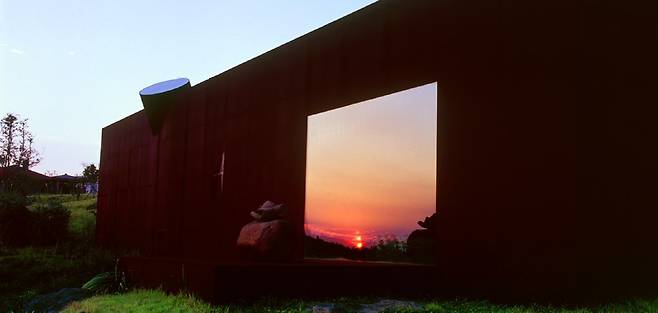 물 컬렉션인 ‘수(水)뮤지엄’에선 태양의 움직임에 따라 하늘을 담는 물의 반사가 달라지는 걸 볼 수 있다. 네모나고 강한 입방체를 타원형으로 도려내 시시각각 변화하는 하늘의 움직임이 물 위에 투영된다. 네모의 수변을 따라 놓인 돌 오브제에 앉아 자연 속에서 ‘무심’이 되어보기를 바라는 건축가의 바람이다. 바람 컬렉션인 ‘풍(風)뮤지엄’은 작은 오두막 같은, 다소 심플한 건물이다.