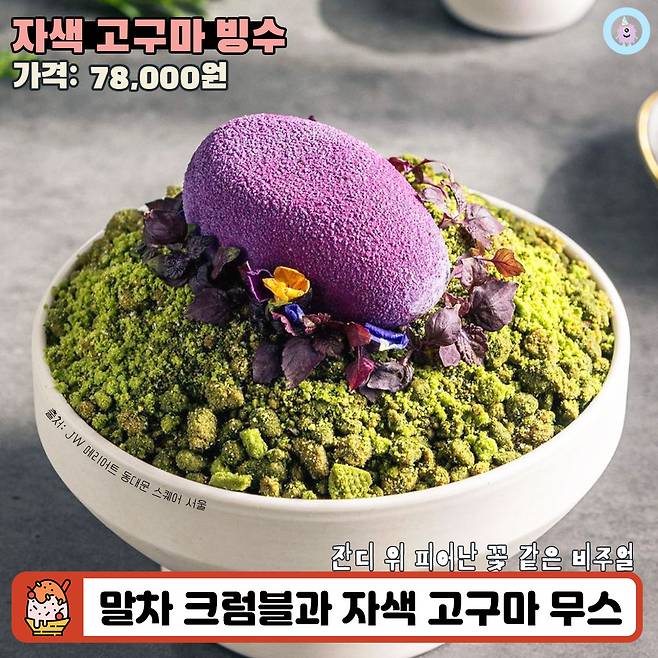 마지막으로 살펴 볼 올해의 호텔빙수는 'JW 메리어트 동대문 스퀘어 서울'의 <자색 고구마 빙수>에요. 한 그릇에 7만8천원으로 형성되어 있고, 빙수보다는 예술 작품에 가까운 이색적인 비주얼이에요.