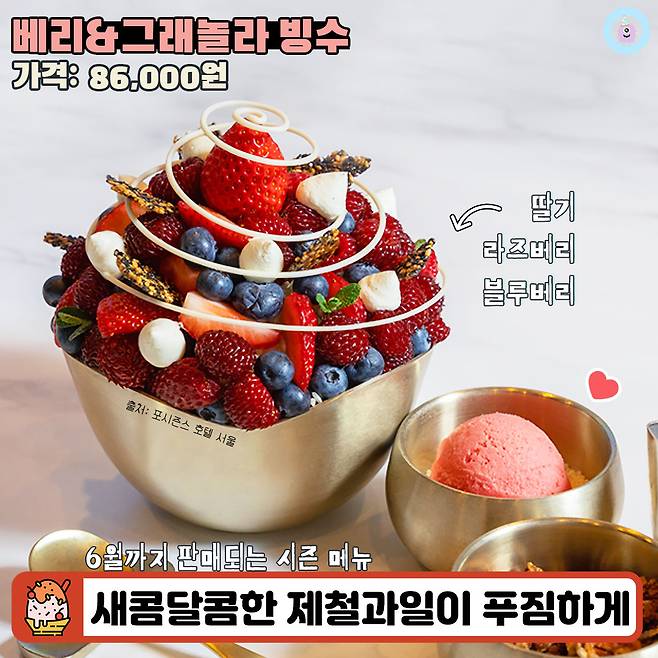 제일 먼저 눈에 띈 건 비주얼만 봐도 상큼 터지는 <베리&그래놀라 빙수>에요! 포시즌스 호텔 서울의 1층 로비라운지 '마루'에서 맛볼 수 있고 가격은 8만6천원이라고 해요..!