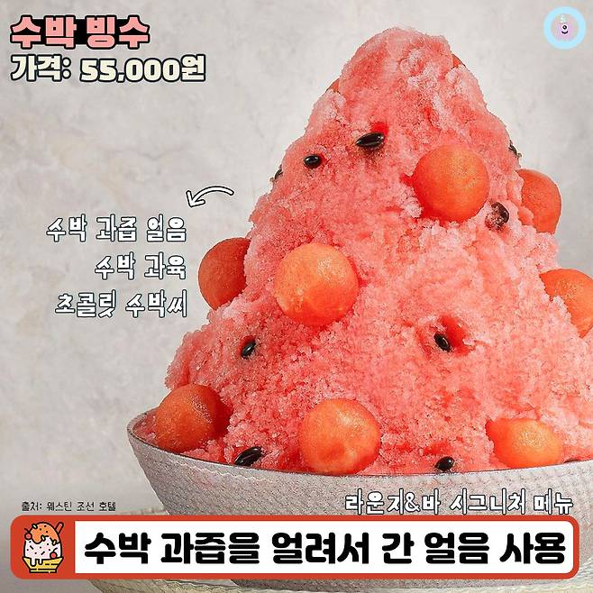 다음은 '웨스틴 조선 호텔'의 <수박 빙수>를 준비해 봤어요. 동글동글한 비주얼이 너무 귀엽지 않나요? 호텔빙수들이 워낙 놀라운 가격을 자랑하다 보니 5만5천원인 수박 빙수가 상대적으로 합리적이게 느껴지는 것 같아요ㅋ.ㅋ