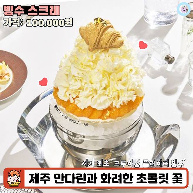 호텔빙수 계의 숨은 강자로 꼽히는 '소피텔 앰배서더 서울'의 <빙수 스크레>도 알아봤어요. 가격은 한 그릇에 10만원으로 형성되어 있는데 비주얼이 화려해서 그런지 가심비가 제일 좋은 메뉴로 느껴졌어요.