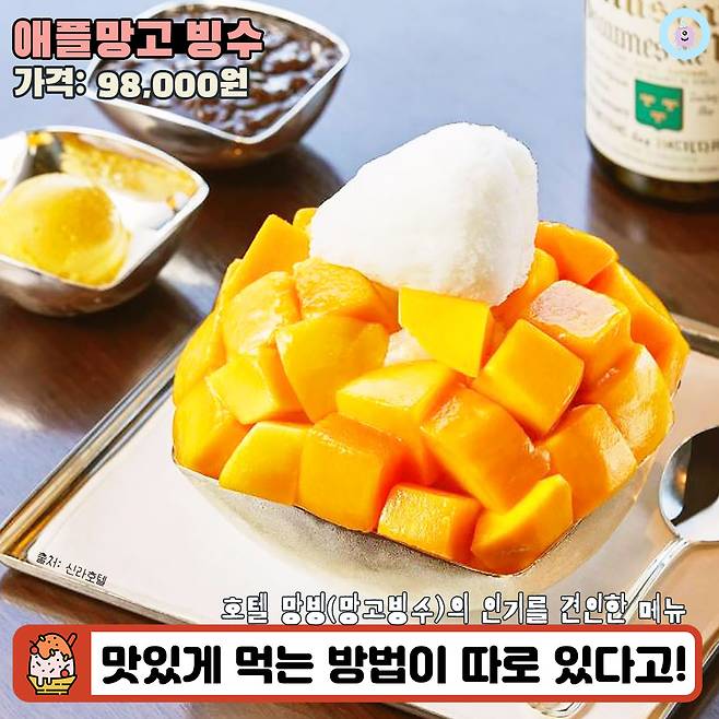 이번에 알아볼 메뉴는 호텔 망빙(망고 빙수)의 인기를 견인한 '신라호텔'의 <애플망고 빙수>입니다. 가격은 한 그릇에 10만원이 채 안되는 9만8천원~!!