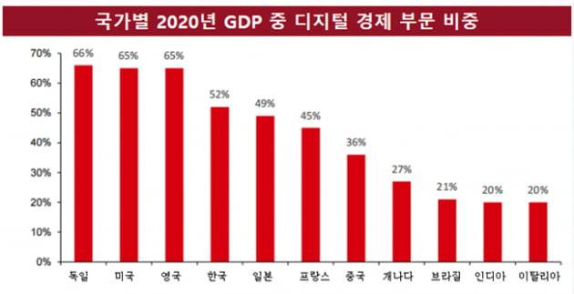 세계 각국은 4차 산업혁명에 본격 진입하기 위해서 디지털 경제의 발전을 도모하고 있습니다. 2020년 디지털 경제 규모가 자국 GDP에서 차지하는 비중을 보면 미국, 독일, 영국 등이 60%를 웃돌고 있고 한국도 50% 이상입니다.