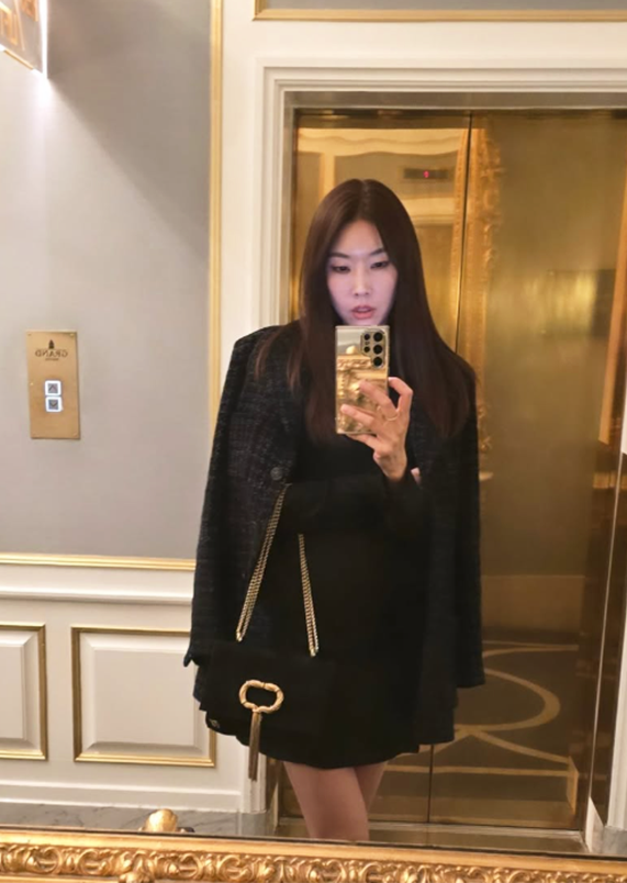 사진 속 한혜진은 블랙 원피스에 골드 체인 장식이 돋보이는 가방을 매치했고, 어깨에 걸친 재킷으로 격식 있는 분위기를 더했다.
