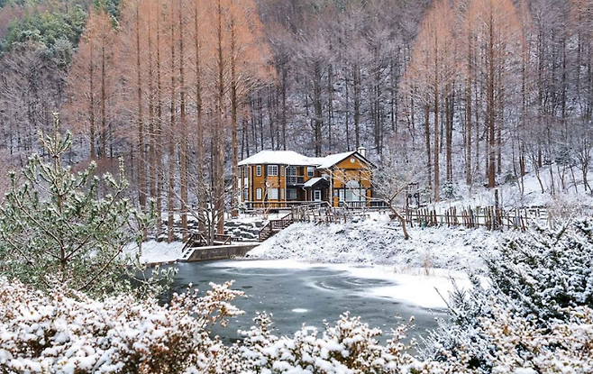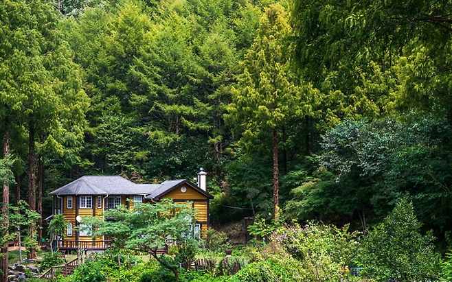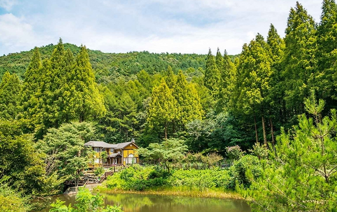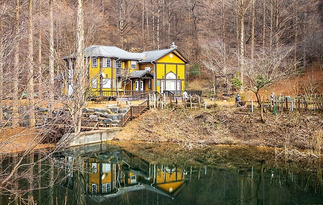 리모델링된 노란 오두막집은 휴양림의 랜드마크! 바로 앞 연못과 함께 이국적인 분위기를 연출해 SNS에서도 ‘동화 속 장소’로 자주 소개되고 있어요.