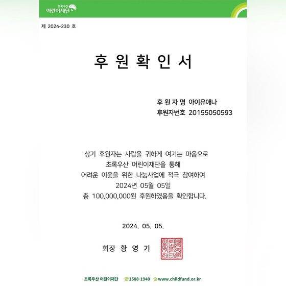 아이유의 소속사 이담엔터테인먼트는 지난 5월 5일 공식 소셜미디어(SNS)에 “모든 어린이들이 사랑받으며 건강한 어른으로 자라기를. ‘아이유애나’가 올봄에도 응원을 보냅니다”라는 글과 함께 후원확인서를 게재했다.