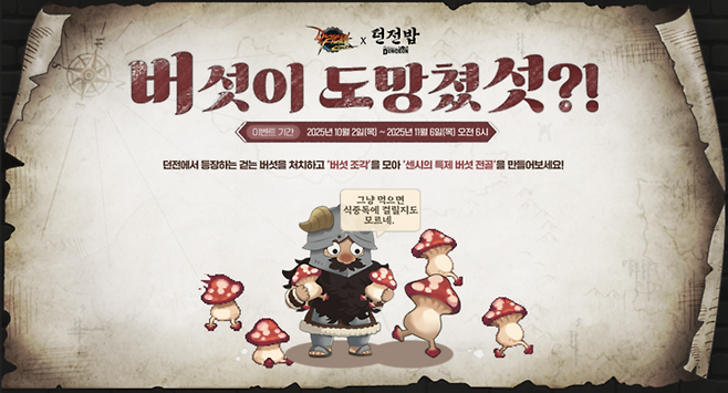 이와 함께 '던전밥' 세계관을 바탕으로 한 기간 한정 콘텐츠도 마련됐다. 오는 11월 6일까지 던전 내 '걷는 버섯'을 처치해 획득하는 '버섯 조각'으로 '센시의 특제 버섯 전골'을 제작할 수 있다. 또한 특정 NPC와 대화를 통해 임무를 수행하면 '던전밥 초상화 테두리 선택 상자', '라이언 코크스' 등 보상을 얻을 수 있다.