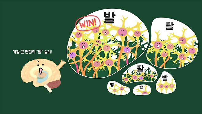 이때 뇌의 언어 센터 어딘가에서는 투표를 진행하는데, 대규모 뉴런 연합이 '발'에 표를 던질 수 있고, 그보다 작은 연합은 '팔'에 표를 던질 수 있습니다. 아니면 아예 다른 쪽에 표를 던진 소수 연합도 있을 수 있습니다.