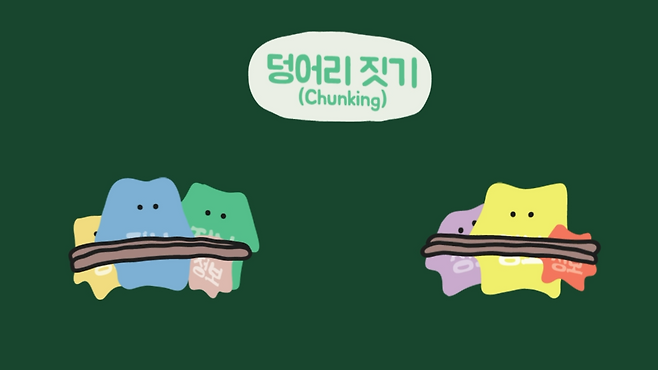 이를 덩어리 짓기(Chunking)라고 하는데, 많은 사람이 의식하지 못하게 이미 하고 있는 방법입니다. 예를 들어 긴 숫자를 외울 때 끊어서 외우면 더 잘 외워지는 이유가 이런 원리입니다.