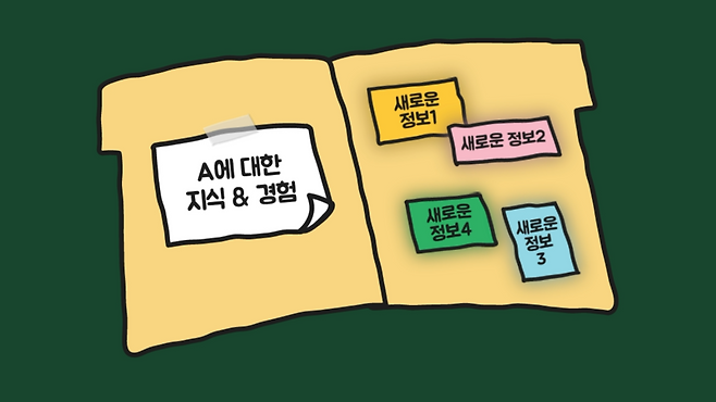 물론 덩어리 짓기만으로 사람이 방대한 양의 정보를 기억할 수 있게 되는 건 아닙니다. 그래서 사람은 망각을 일으키는 간섭 현상에 대응하기 위해 정보 정리 도구 중 하나인 도식(Schema)을 이용합니다.