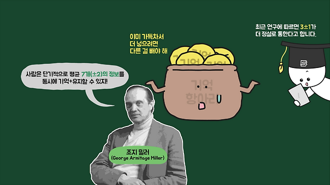 1956년 인지심리학이라는 신생 분야의 창시자 중 한 명인 조지 밀러(George Armitage Miller)의 논문에는 인간의 뇌가 머릿속에 보관할 수 있는 정보의 양에 한계가 있다고 주장합니다.