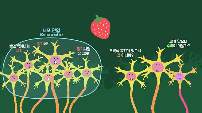기본적으로 뉴런은 모든 종류의 신경 계산에서 작은 역할을 하나 할 뿐이고, 맡은 작업을 해내기 위해 다른 뉴런과 연합하며, 이를 '세포 연합(Cell assemblies)'이라고 합니다.