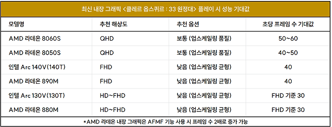 라데온 880M, 780M이나 아크 그래픽스(Xe7, Xe8, 인텔 코어 울트라 100H 시리즈)의 경우 프레임이 그보다 10프레임 정도 낮게 나온다. 옵션을 더 낮추거나 업스케일링 옵션을 더 적극적으로 사용해야 한다.