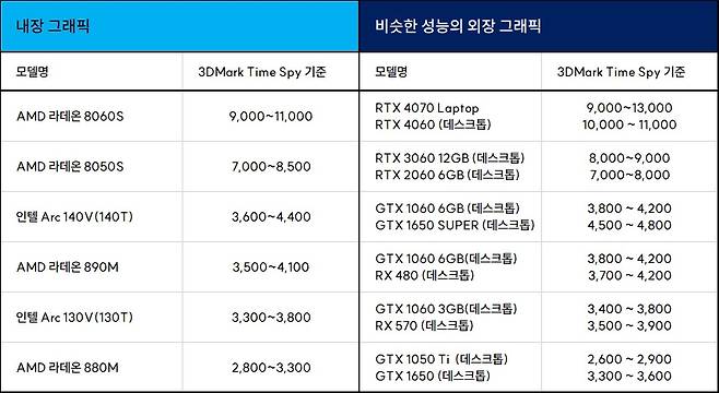 이제는 이야기가 다르다. 지난해 인텔 아크 140V와 AMD 라데온 890M이 나오면서 드디어 내장 그래픽이 GTX 1060의 자리를 위협하기 시작했으며, 라데온 8060S, 8050S(스트릭스 헤일로)는 한술 더 떠서 최신 그래픽카드와 어깨를 나란히한다.