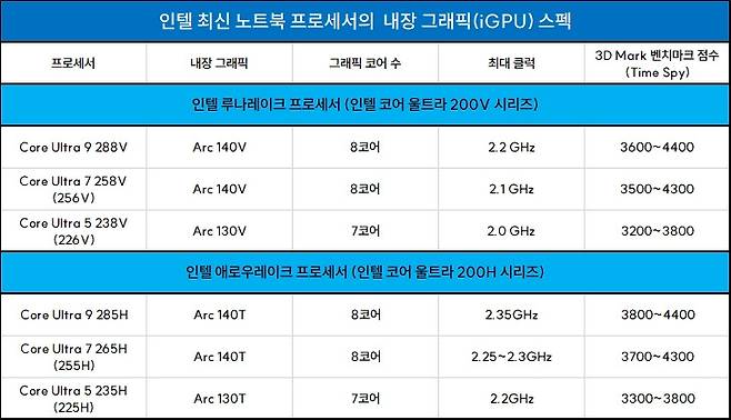 인텔 진영의 최신 노트북 프로세서는 아크(Arc) 내장 그래픽으로 탈바꿈했다. 한때 3D그래픽 감속기라는 오명을 듣고 다녔던 인텔 내장 그래픽이지만 이번 아크 내장 그래픽이 나온 뒤로는 상황이 반전됐다.