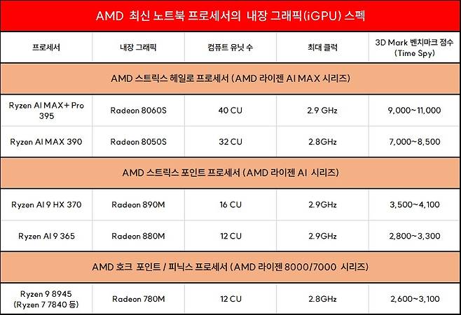 AMD 진영의 최신 노트북 프로세서는 코드네임 스트릭스 헤일로, 스트릭스 포인트(크라켄 포인트)로 불린다. 등급에 따라 내장 그래픽 스펙이 많이 다르기 때문에 주의를 기울여야 한다.