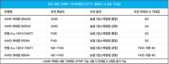 인텔 아크 140V(140T)와 라데온 890M은 비슷한 결과를 보인다. 사이버펑크 2077 FHD 해상도에서 업스케일링 균형 모드 적용 시 낮음 프리셋으로 평균 60프레임을 확보할 수 있다.