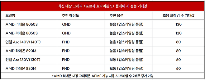 레이싱 게임 중 대중성으로 인기가 높은 <포르자 호라이즌 5>는 이제 내장 그래픽으로도 쉽게 정복할 수 있다. 라데온 8060S, 8050S는 QHD 해상도에서 높음 이상의 프리셋에 고주사율 플레이도 가능하며, 아크 140V, 라데온 890M 또한 업스케일링 기능을 사용하면 FHD 해상도에 높음 프리셋으로 60프레임 이상을 확보한다.