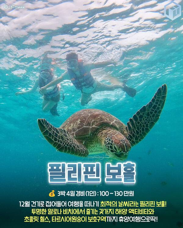 또 키세스 초콜릿 모양의 낮은 언덕의 군락지인 초콜릿 힐스와 세계에서 가장 작은 영장류인 타르시어원숭이 보호구역까지 휴양과 관광까지 두마리의 토끼를 다 잡을 수 있는 12월 해외여행지로 제격입니다.