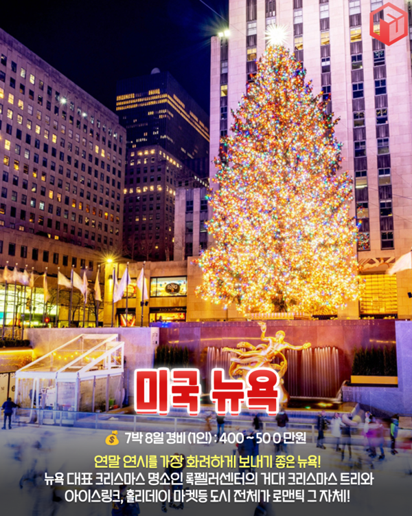 특히 뉴욕 대표 크리스마스 명소인 록펠러센터의 거대 크리스마스트리와 아이스링크는 마치 영화 속 한 장면 같아 걷기만해도 로맨틱한 분위기가 가득합니다. 또 홀리데이 마켓, 브로드웨이 뮤지컬 공연은 연말까지 지속되어 오직 뉴욕에서만 느낄 수 있는 특별한 볼거리르 선사합니다.