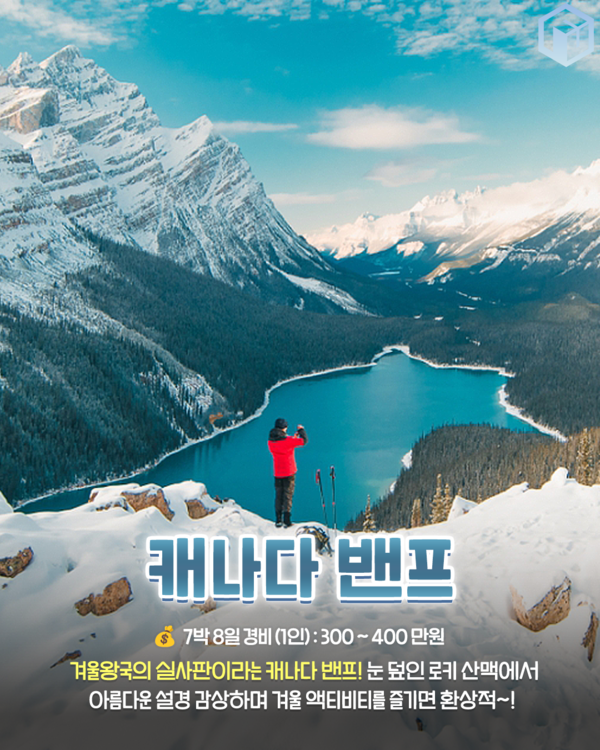 겨울왕국의 실사판이라는 캐나다 밴프는 12월 눈 덮인 로키 산맥의 아름다운 설경이 경이롭기로 유명한 12월 해외여행지입니다. 특히 바라만 봐도 좋은 풍경 속에서 스키 외에도 스노보드 등 다양한 겨울 액티비티를 즐기기 좋아 겨울스포츠 애호가들에게 천국과도 같은 곳입니다.
