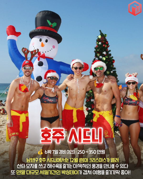 남반구 호주 시드니에서는 12월 따뜻한 날씨 속 썸머 크리스마스가 열려 시드니 곳곳에서 이색적인 풍경을 만나볼 수 있습니다. 산타 모자를 쓰고 해수욕을 즐기거나 서핑등 흔히 볼 수 없는 이색적인 장면들이 독특한 재미와 볼거리를 제공하죠.