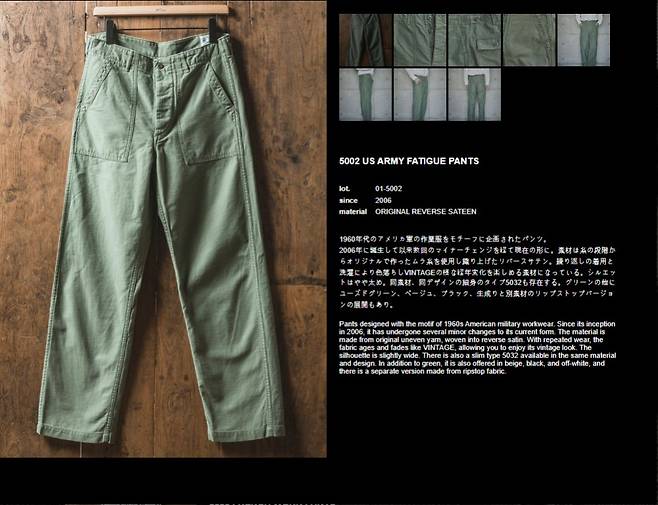 이런 작은 디테일이 모여 멋을 만든다. 투박한 20세기 군용품의 아우라를 소환시키는 것. 복각 전문 밀리터리 패션 브랜드의 매력이다. 이런 노력에 기꺼이 값어치를 지불하는 사람들은 퍼티그 팬츠의 경우, 오어슬로우(orSlow)를 높게 산다. 국내 편집샵에서 매긴 가격은 평균 20만 원대 후반. 국내 패션 커뮤니티를 살피면 ‘가격은 세지만 두고두고 오래 입기 좋은 바지’로 손꼽힌다. 세탁 후 원단수축과 물빠짐이 거듭될수록 진가를 드러낸다는 게 오어슬로우 마니아의 공통 증언이다.