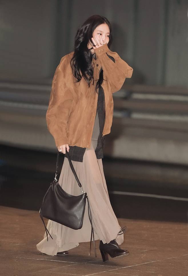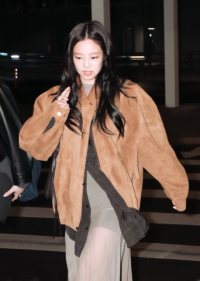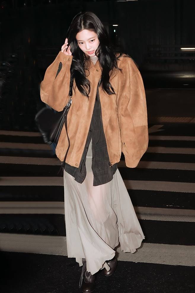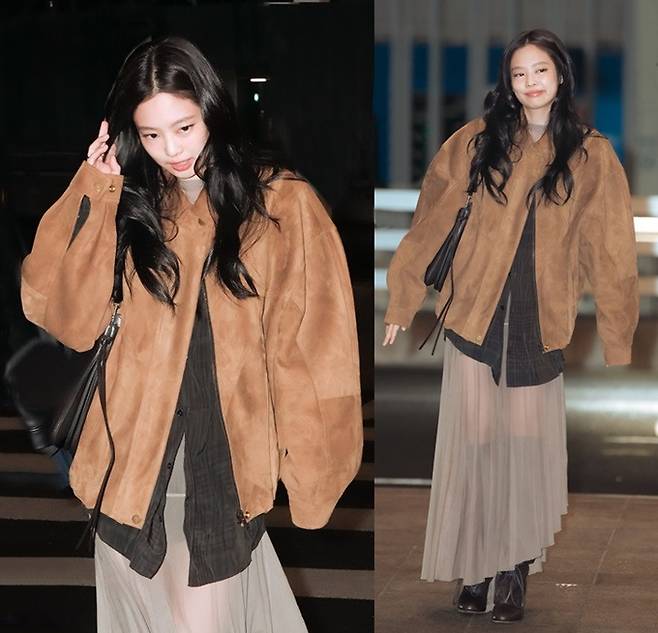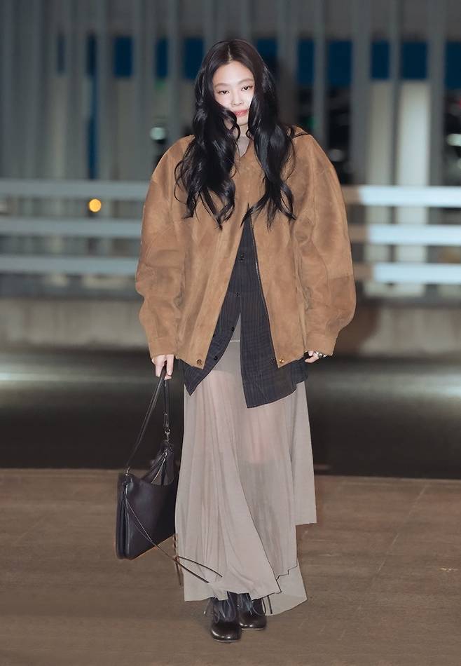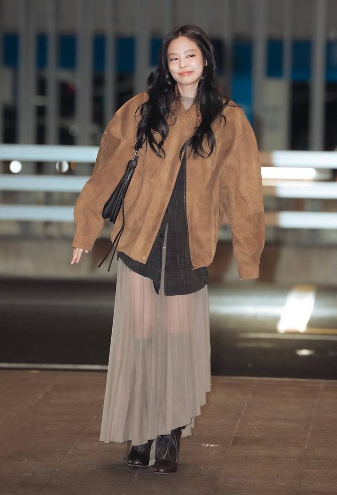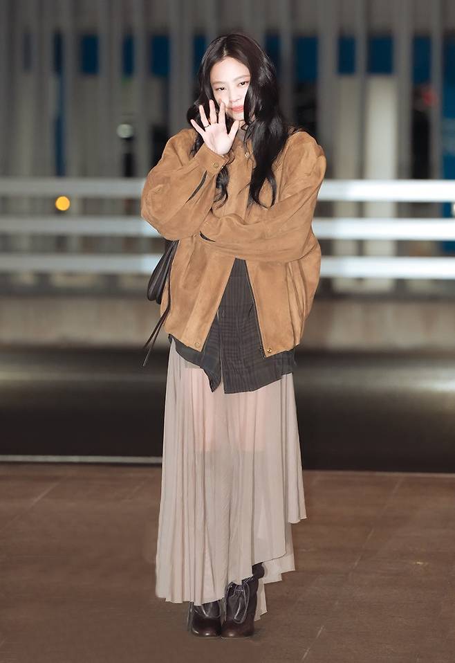 이날 제니는 스웨이드 재킷과 하늘거리는 시스루 롱스커트를 매치한 자유롭고 예술적인 분위기의 보헤미안룩을 연출했다.