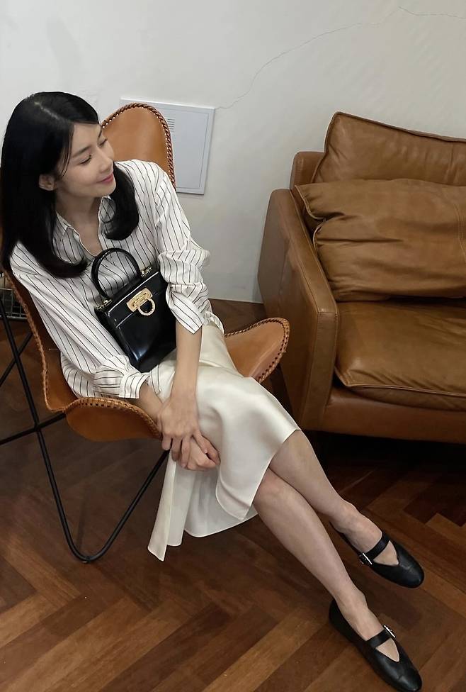 블랙 메리제인 플랫슈즈와 미니백은 룩에 균형을 잡아줬다. 군더더기 없는 스커트 라인과 소재 특유의 은은한 광택이 고급스럽게 빛난다.