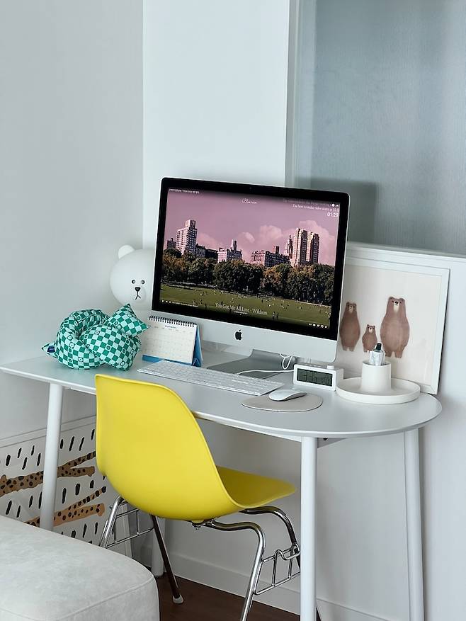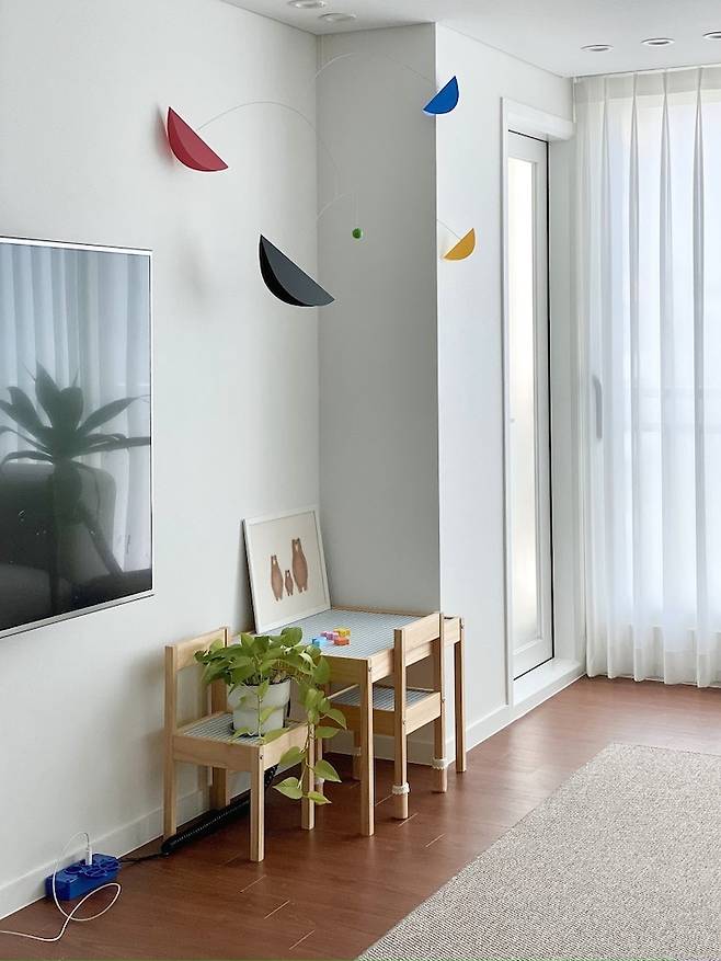 내력벽 옆에 있던 아이의 책상은 답답한 벽을 바라보고 있어서 거실을 볼 수 있게 옮겨보았어요. 거실 가구들은 혼자서도 쉽게 옮길 수 있어서 조금씩 옮겨보는 재미가 있어요.
