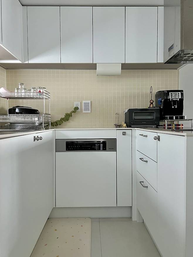 ㄷ자 싱크대로 구조를 정하면서 싱크볼 우측으로는 식기세척기를 설치해 주었어요. 애벌세척 후 바로 식기세척기 안으로 넣을 수 있고 이리저리 옮겨 다니지 않고 바로 꺼내서 서랍장으로 옮길 수 있어서 너무 편하게 사용하고 있어요.