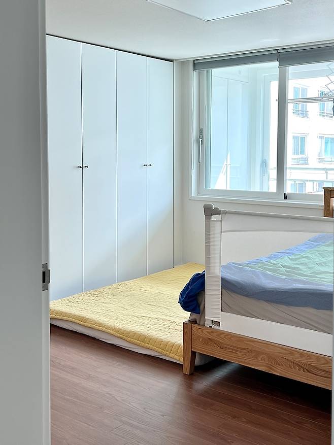 아이와 함께 자고 일어나는 안방이에요. 침대 옆에는 토퍼 매트리스를 깔아두어 뒹굴뒹굴 굴러다니는 아이가 혼자 편히 자거나 함께 잘 때도 있어요.