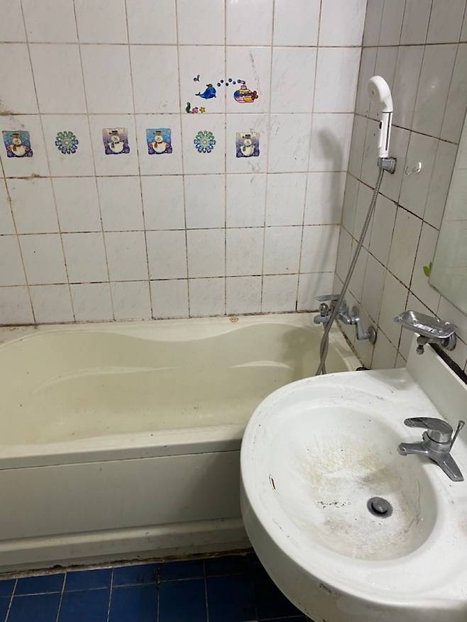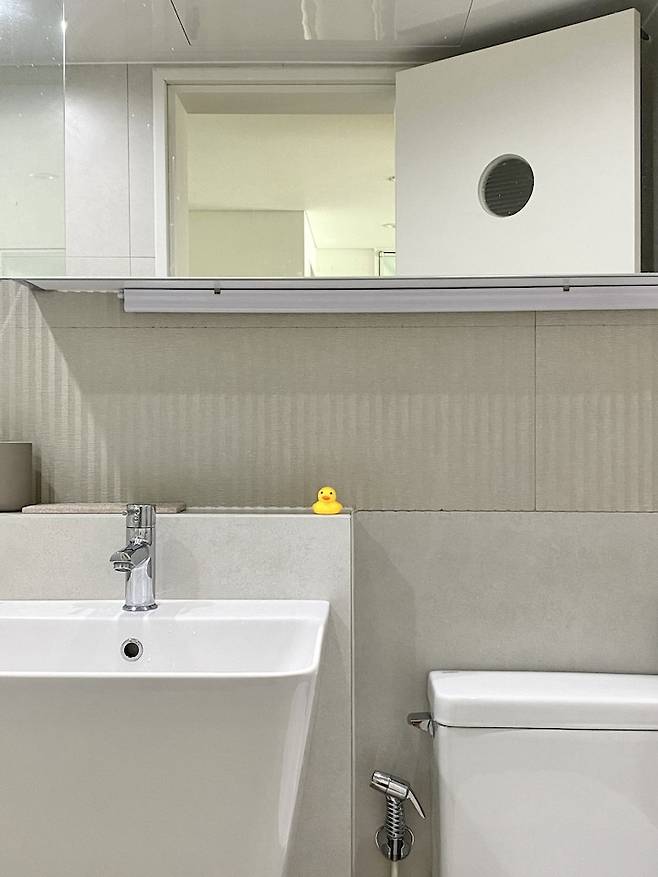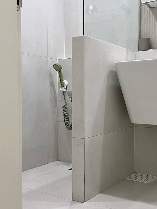 아이가 아직 어리다 보니 화장실 바닥에 물기가 있지 않도록 하기 위해 샤워 공간을 조적 파티션으로 분리하여 물이 밖으로 넘치지 않도록 했어요. 큰 타일이라 물을 머금고 있는 곳도 적어서 평소에는 건식처럼 사용하고 있어요.