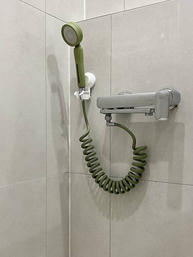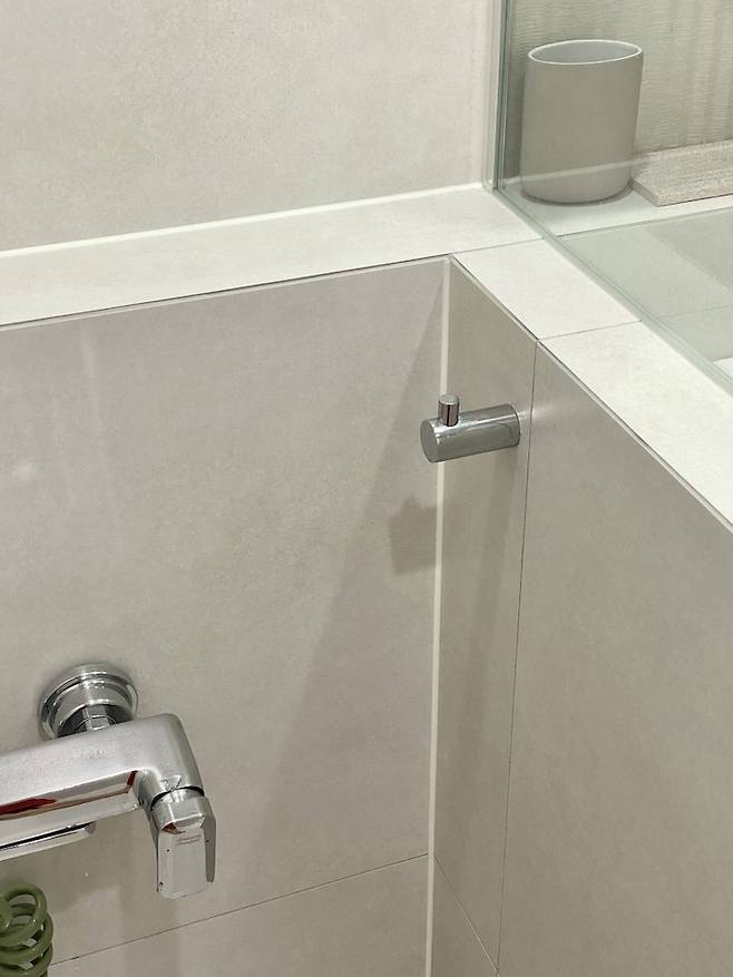 언커먼샤워기도 사용한 지 1년이 넘었는데 물때가 끼지 않아서 따로 청소해 주지 않아도 되고 아이를 씻길 때 손이 닿는 곳에 샤워기가 있어야 편해서 이케아 흡착 샤워기 걸이를 붙여두었어요. 샤워기 옆에 수건걸이를 설치해서 샤워볼을 걸어두어요. 거실에서는 조적벽이 가려주어서 욕실 문을 열어두어도 전혀 지저분해 보이지 않아요.