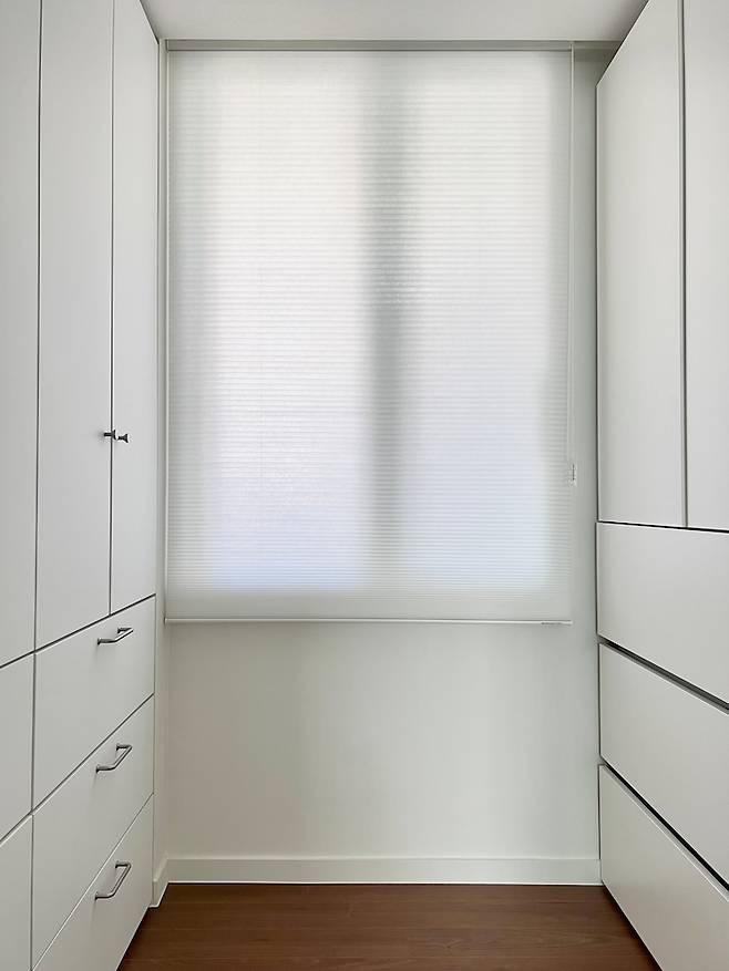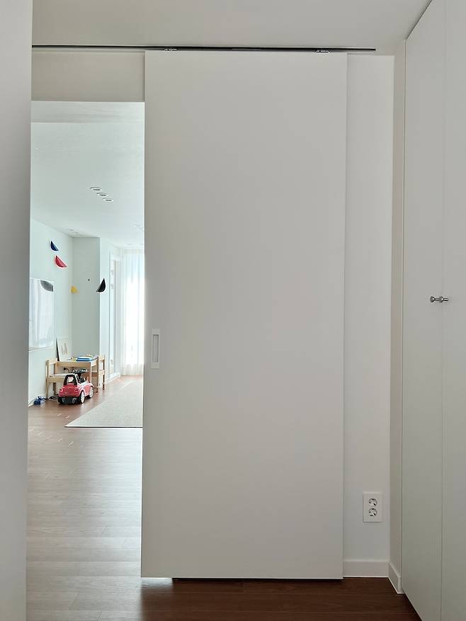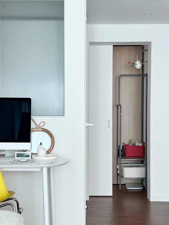 드레스룸의 도어는 어떤 방식으로 할까 고민이 많았어요. 슬라이딩 도어로 해도 생각한 만큼 공간을 많이 사용할 수 있을까? 고장이 잘 나지 않을까? 지금까지 고장 없이 좁은 공간까지 잘 사용하고 있어요.