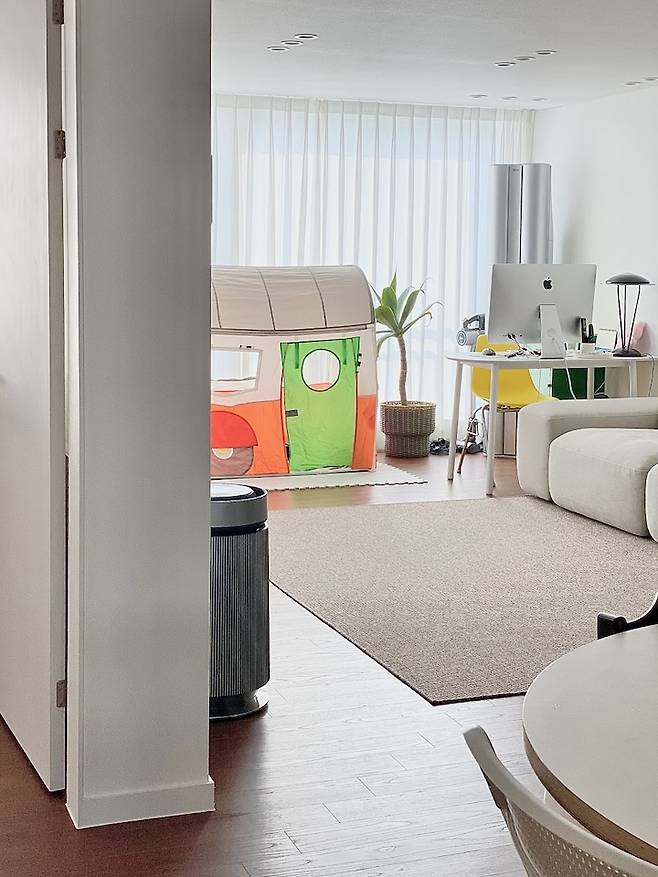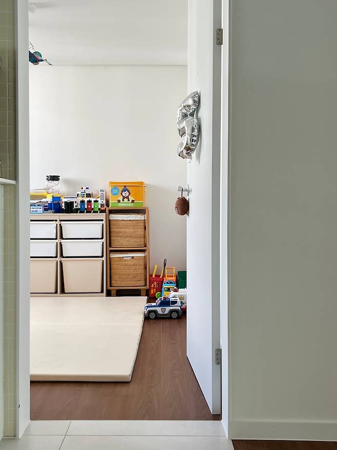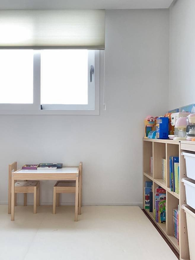확장된 베란다 공간에는 전에 사용하던 아이의 장난감과 소박한 홈 오피스가 공존하고 있었어요.