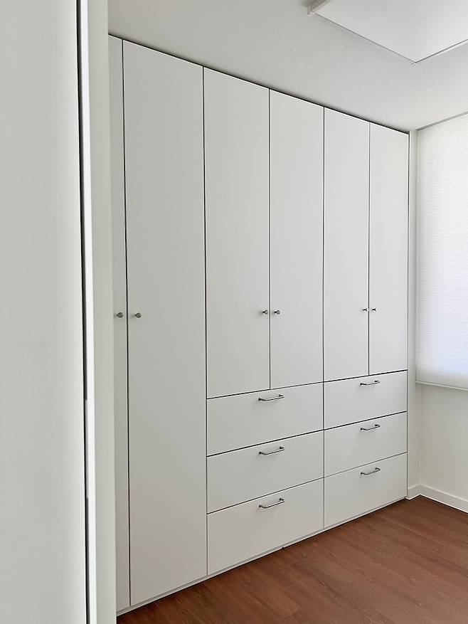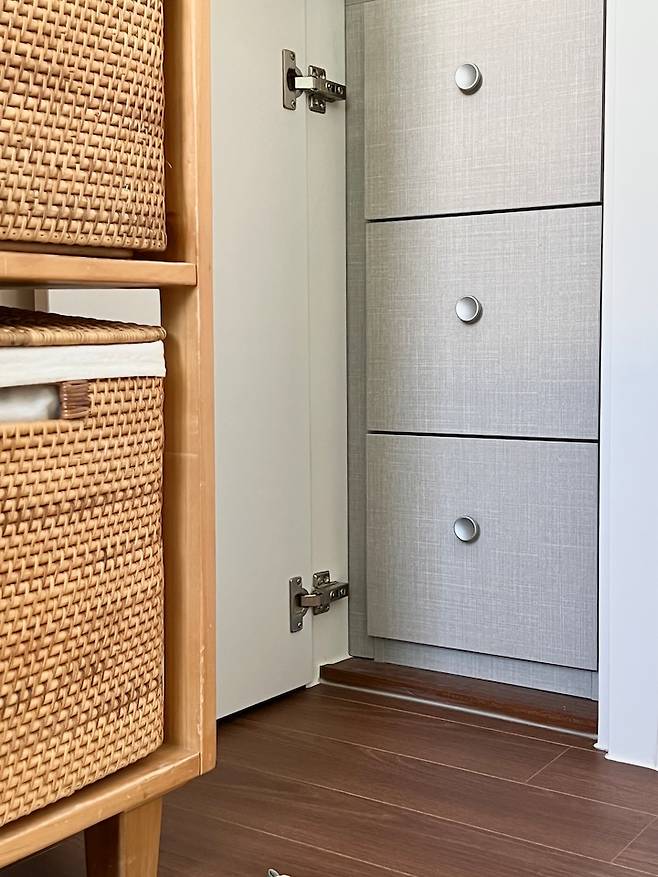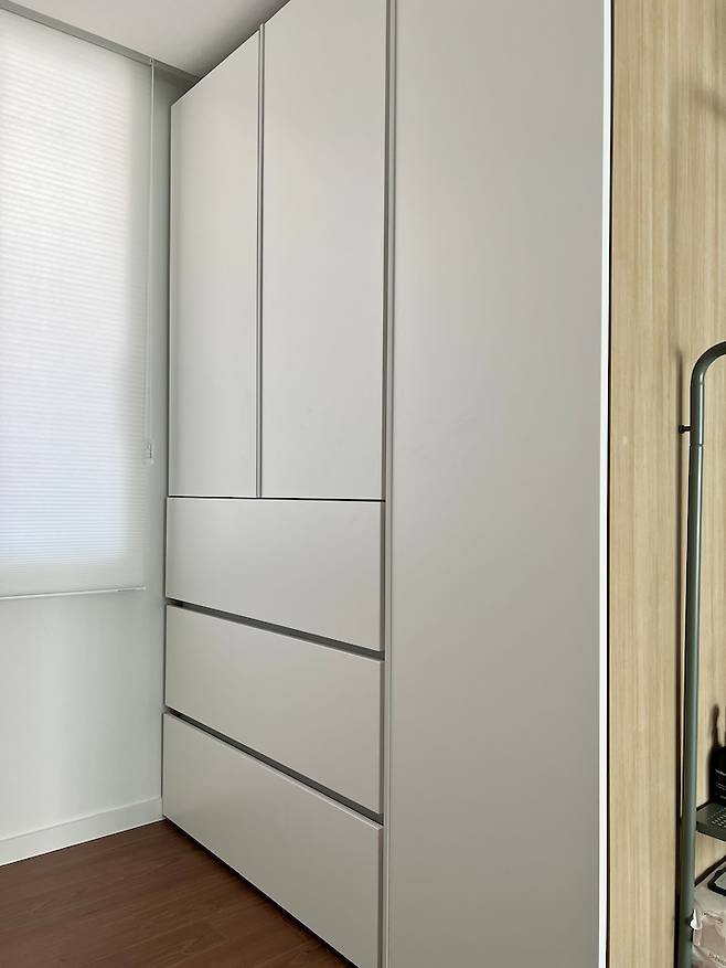 남아있던 짐들을 정리하다보니 수납이 부족해서 붙박이장과 자연스럽게 어울릴만한 디자인을 중에 한샘장을 구매한 뒤 맞은편에 설치해 주었어요.