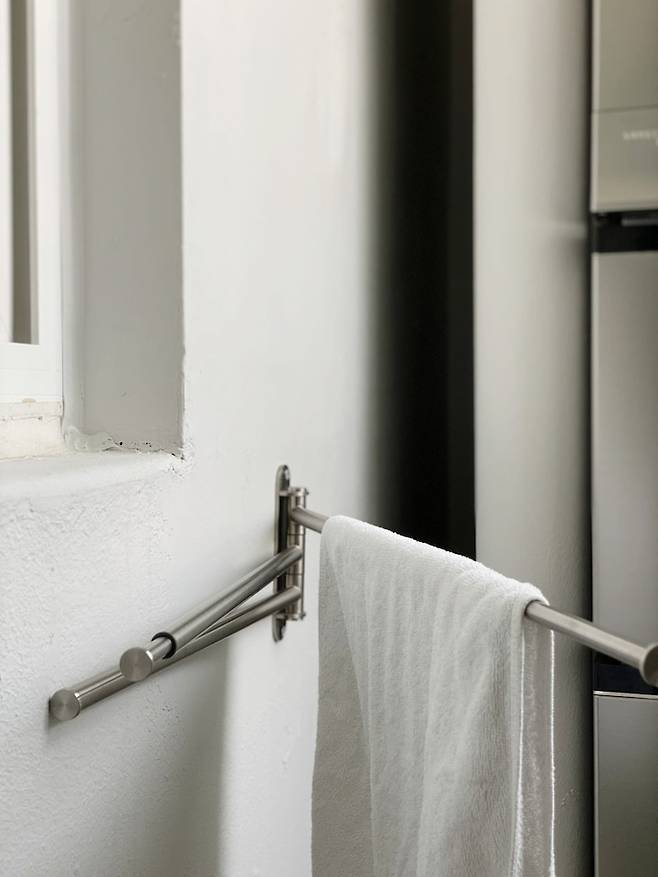 한쪽 벽면에 이케아 수건걸이를 설치해서 축축한 빨랫감들을 말려주는 곳으로 사용하고 있어요. 사용하지 않을 때는 벽면에 밀착 시켜두고 3단에 길이도 조절돼서 생각보다 많이 걸어 둘 수 있어서 편하게 사용하고 있어요.