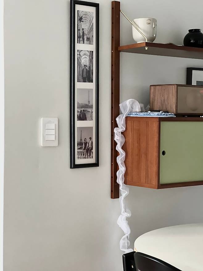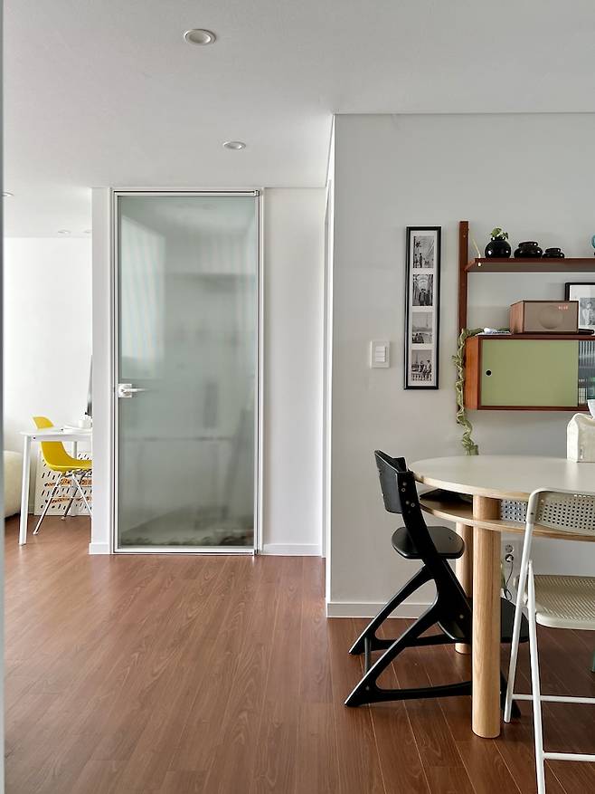 저희 집에서 제가 제일 애정하고 대표하는 공간이에요. 시스템 선반과 식탁은 언커먼하우스의 가구이고 견고하고 단단한 가구가 주는 느낌이 큰 것 같아요. 시스템 선반에는 가족사진과 오브제를 많이 올려 두었다가 지금은 많이 덜어둔 상태에요. 식탁 아래로 수납공간이 있어 자주 쓰지 않는 물건들을 보관하기에도 편하답니다.
