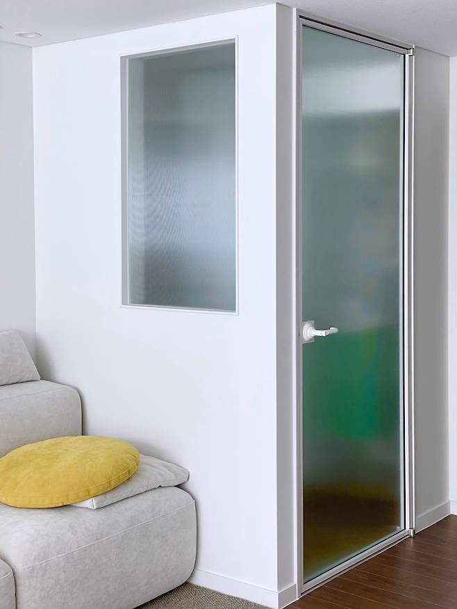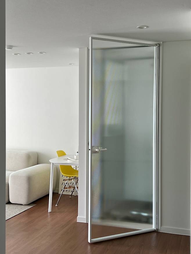 낮은 천장에도 잘 어울리는 슬림한 플레임의 중문이에요. 심플한 디자인과 플루트 유리로 맞춘 도어는 모루 유리보다 간격이 더 촘촘해요. 플루트 유리의 촘촘한 간격이 마치 블러 처리가 된 것 처럼 보여서 안팎으로 잘 보이지 않아요. 사생활 보호와 어지럽게 놓여진 신발도 보이지 않는 장점이 있어요.