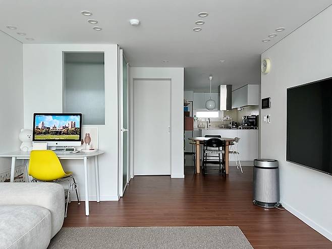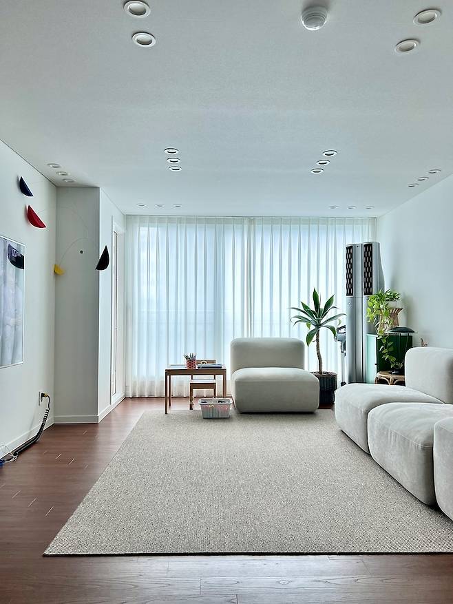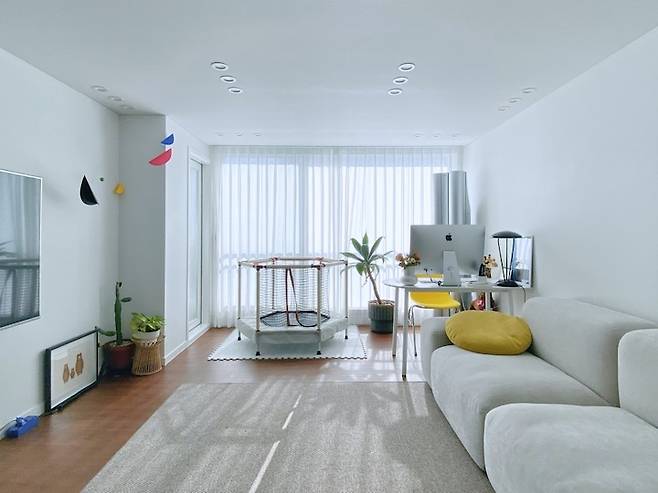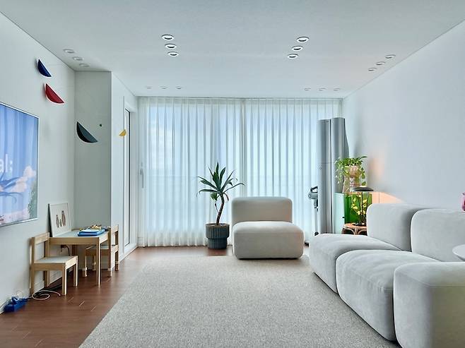 저희 가족의 주 생활 공간인 거실이에요. 오래된 구축 아파트의 단점이자 장점은 통베란다인데 아이의 활동과 넓은 거실을 위하여 확장공사는 필수였어요. 베란다 확장 후 하자가 발생하는 분들을 봐서 걱정이 많았지만 1년이 지난 사계절 동안 문제없이 지내고 있답니다.