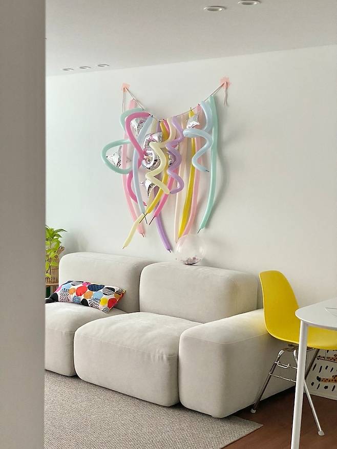 아이의 생일에는 풍선 가랜드를 만들어줘서 꾸며줬더니 또 다른 분위기로 변신했어요. 흰 도화지에 원하는 그림을 그리듯 다른 분위기로 꾸며 줄 수 있는 곳이에요.
