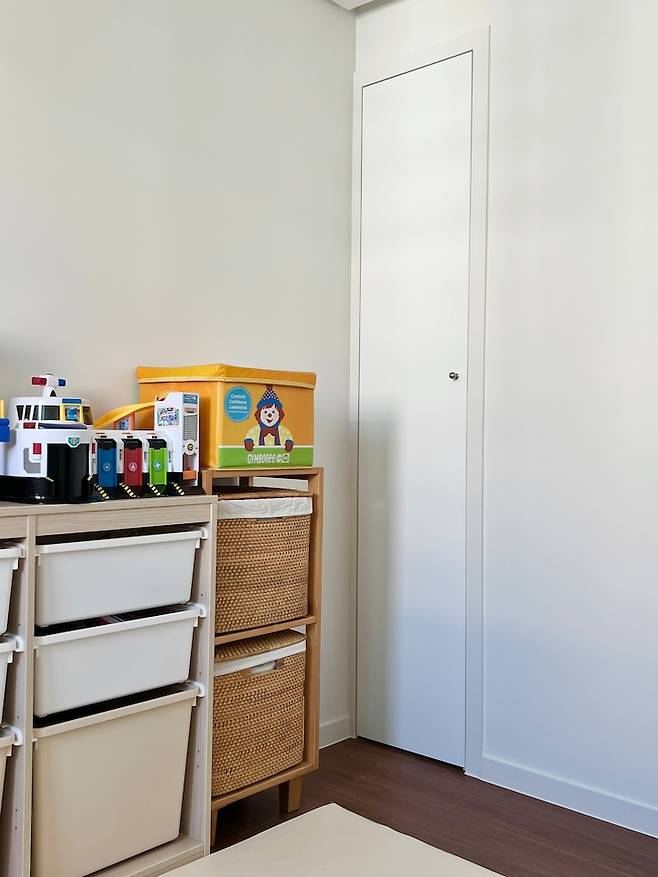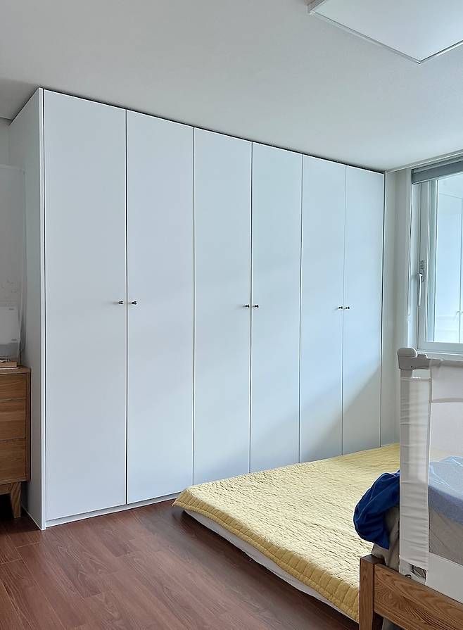 작은 붙박이장은 처음에 도어를 없앨까 고민했지만 아이가 나중에 짐이나 옷을 보관하고 가릴 수 있도록 하고 싶어서 도어를 설치했답니다. 하부엔 서랍장을 짜넣어서 생필품들을 보관하고 있어요. 손잡이를 바꾸고 싶은데 가구 사장님께서 손잡이 나사가 보이지 않게 만들어 오신 덕에 기존 손잡이로 사용 중이에요.