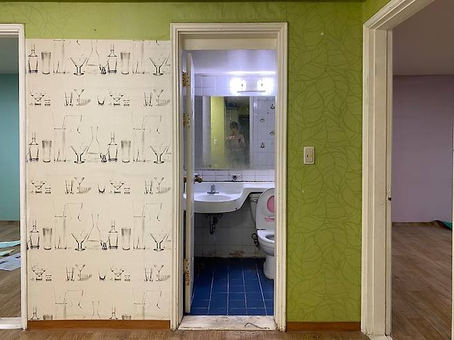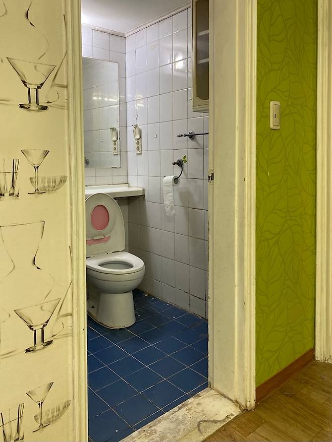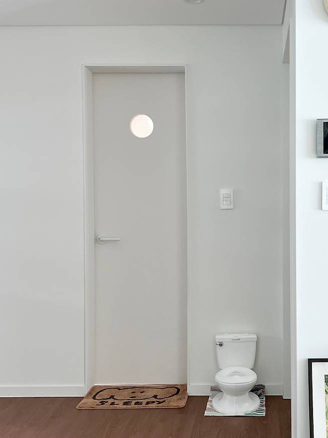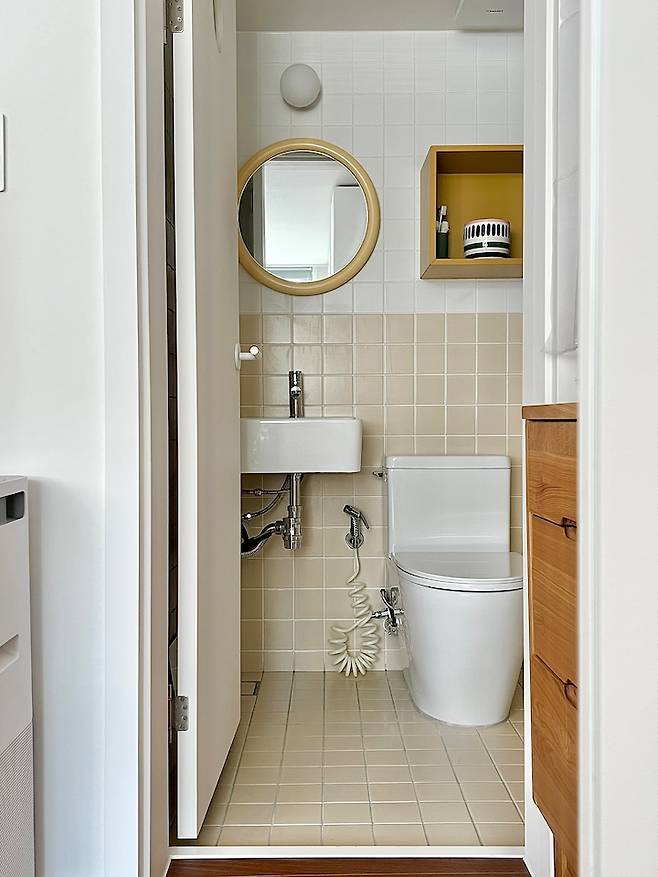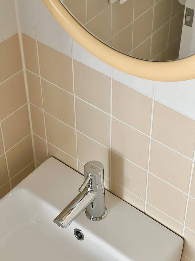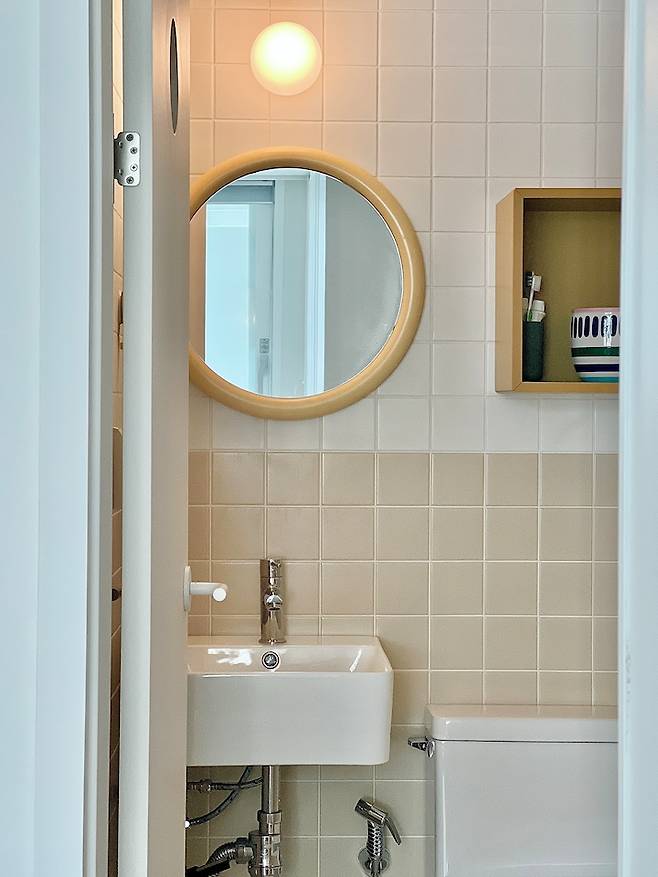 거울 뒤의 타일은 많이 보셨을 타일로 포인트를 주었는데 다른 타일도 좋았을 것 같아요. 화장실 문은 사장님께 원형으로 꼭 하고 싶다고 타공을 부탁드려서 만들어진 부분이에요. 유리 마감을 반투명 실리콘으로 해주셔서 색 변색과 마감 부분이 아쉽지만 조명이 켜질 때 아주 귀여운 포인트가 돼준답니다.