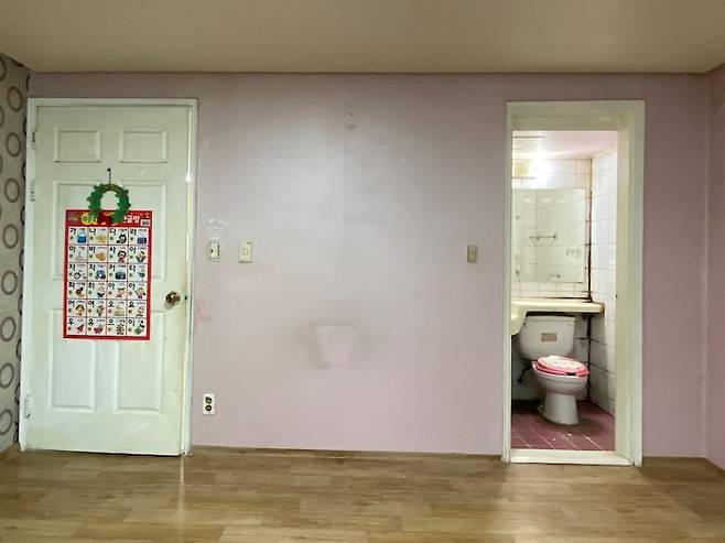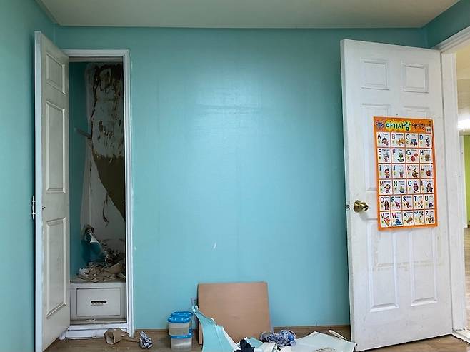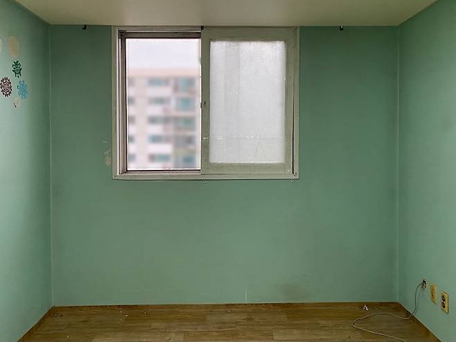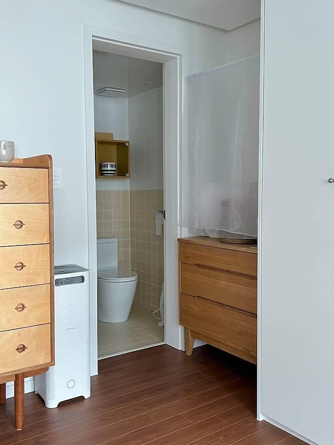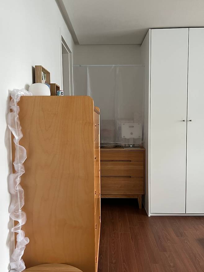 안방 장은 욕실 입구까지 맞추지 않았어요. 입구의 벽면 쪽이 공간이 좁아서 입구의 반이 막혀버리는 일이 생기게 돼서 수납장을 넣어 공간을 사용하기로 했고 가구 크기만큼 비워두기로 했어요. 서랍장 위에 짐을 잠시 보관 중이라 임시로 코드 삭스를 만들고 남은 원단을 가림막으로 사용하고 있어요.