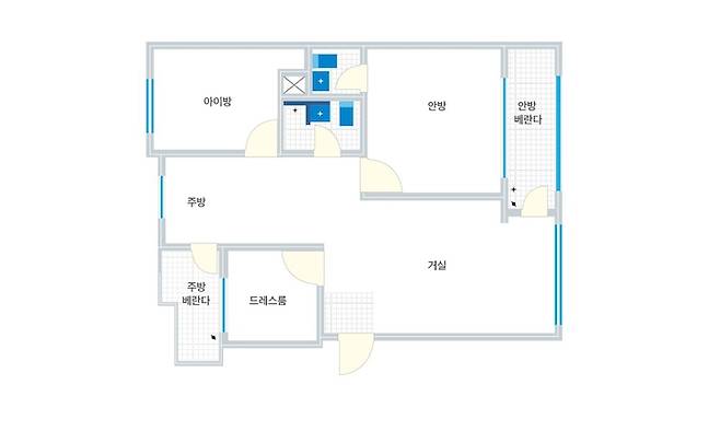 저희 집은 구축 아파트의 전형적인 27평 구조이지만 욕실이 2개라는 큰 장점이 있는 집이에요. 거실 베란다 확장 공사는 필수였기에 제가 만든 도면에서는 표현해두지 않았어요.