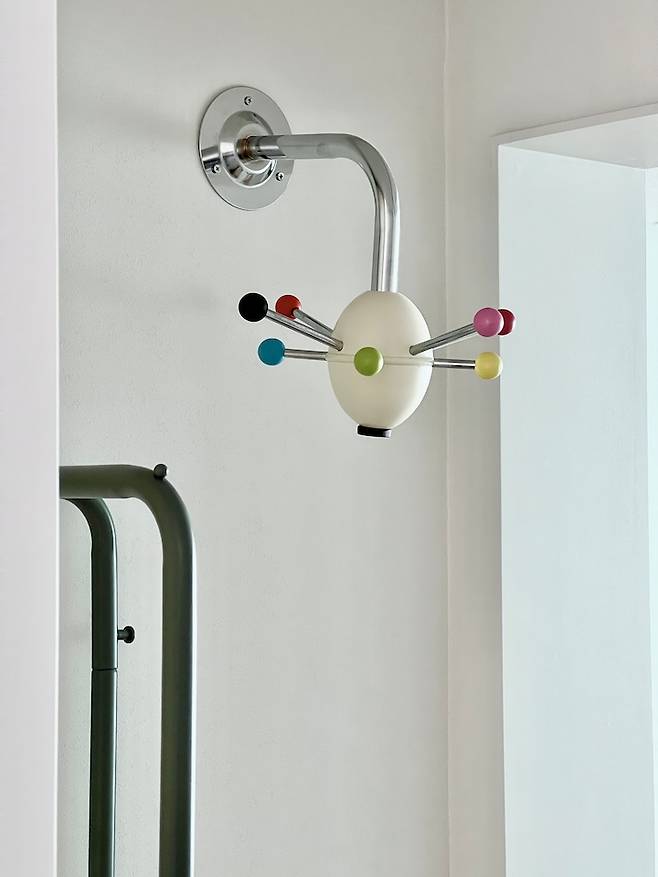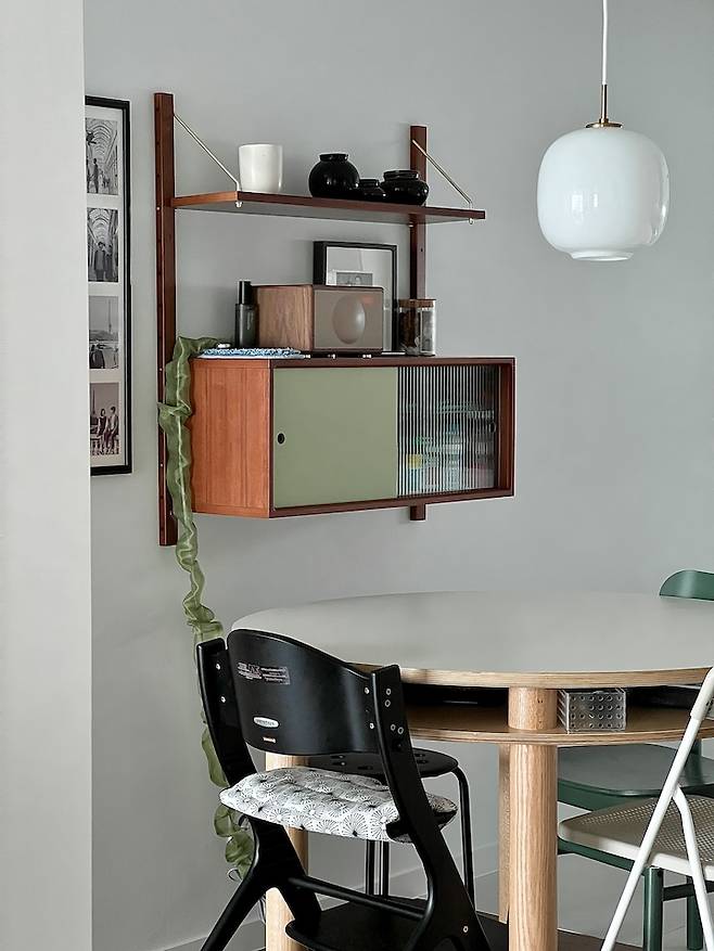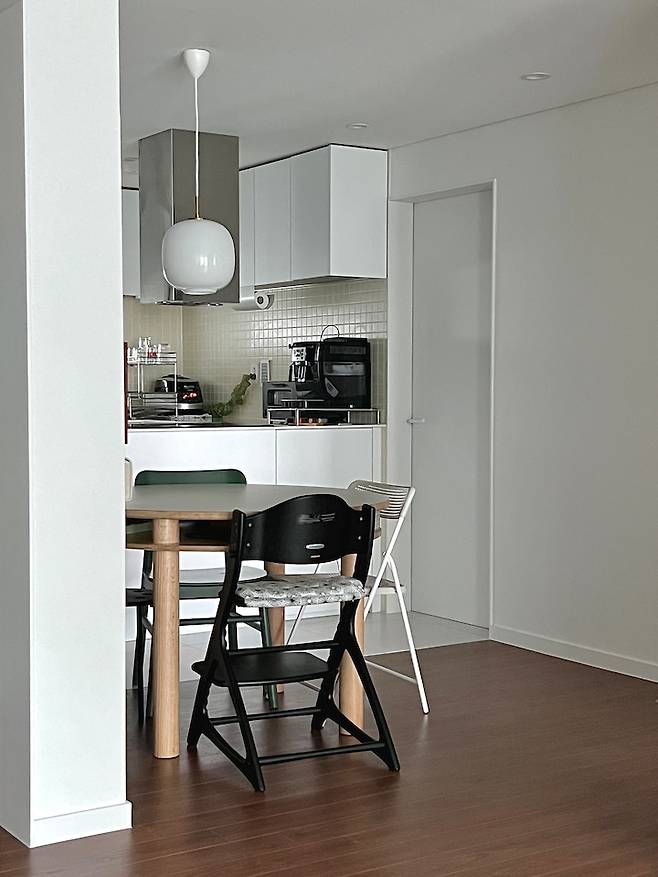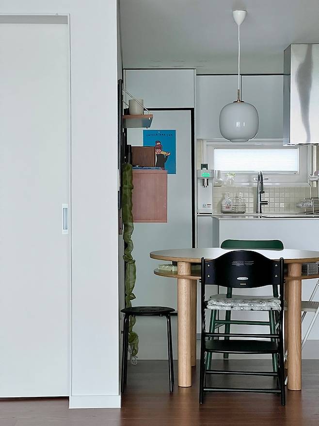 이케아 접이식 의자는 언젠간 새로 들어올 의자 대신 사용 중이에요. 식탁조명은 심플한 루이스폴센 VL45을 선택했는데 시스템 벽 선반과 식탁 사이에 있어도 복잡하지 않아 잘 주변 공간과 잘 어울려지는 멋진 조명이에요.