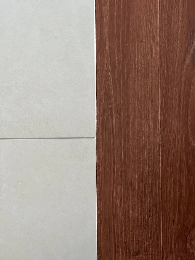 현관 타일은 쉽게 더러워지기 때문에 관리하기 편한 그레이 톤의 테라조 600각 타일로 했어요. 오염이 되어도 눈에 잘 띄지 않아서 저처럼 부지런하지 않은 분께 추천드려요~