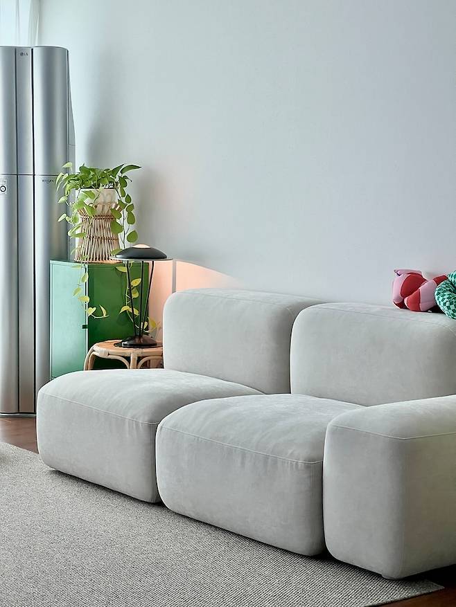 모듈 소파의 앉는 부분이 생각보단 짧아서 저와 남편의 허벅지를 다 받쳐주지 않더라고요, 그래서 엄청~편하다는 느낌은 부족해요. 그래도 디자인은 깔끔하고 귀여우니 용서돼요~
